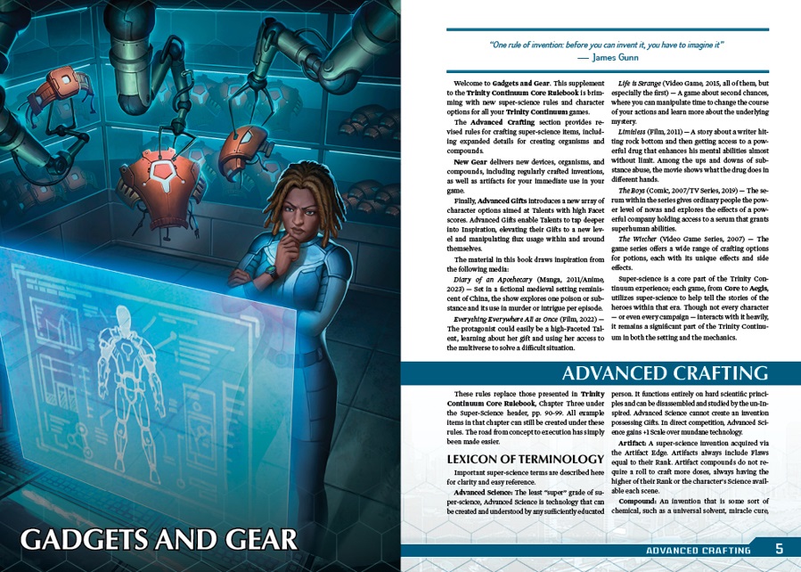 Talents in Trinity Continuum are capable of amazing feats of super-science. Through advanced application of Medicine, Science, or Technology, Talents can push their inventions beyond the boundaries of modern knowledge. Whether crafting serums and drugs to enhance themselves, cloning or engineering creatures to aid their heroic tasks, or constructing devices to augment their capabilities, scientifically inclined Talents take their fields of study to new horizons.