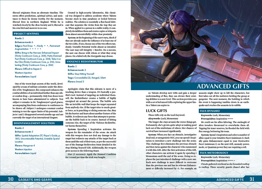 Trinity Continuum: Gadgets and Gear expands and streamlines the rules for super-science, making it easier for Storyguides and players to create Inventions for use in their games. In addition to the new rules, this book provides examples of the new rules being used and a collection of new gear ready to be used in any Trinity Continuum game. Furthermore, this book introduces Advanced Gifts, which allow Talents to access new heights of power!